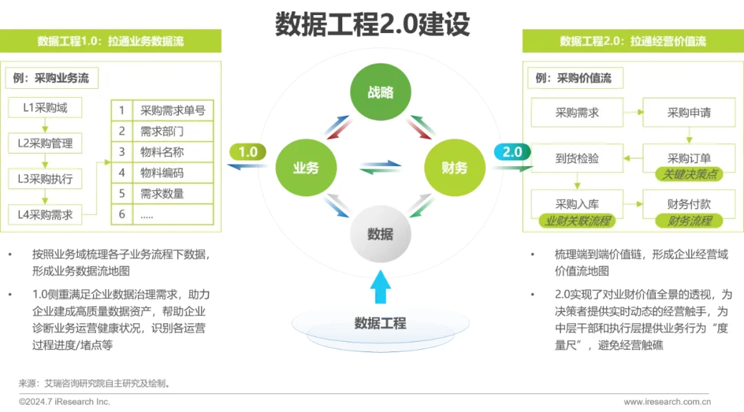 数据工程1.0核心围绕企业全业务域梳理业务数据流,形成业务数据地图,帮助企业诊断业务运营健康状况,识别并分析各运营过程的进度或堵点等。数据工程2.0从企业战略出发,以“创造价值”为内核,进一步拉通业务运营与财务数据,形成业务决策与财务核算融合的企业“运营孪生体”,前置化感知企业经营行为对财务报表的影响结果,在企业战略运营、全面预算、成本管控、现金流调度、司库管理等方面,赋能企业顺利获得最佳资源与资金配置,引导并实现价值增值与流动,发挥业财大数据价值。