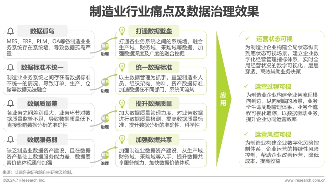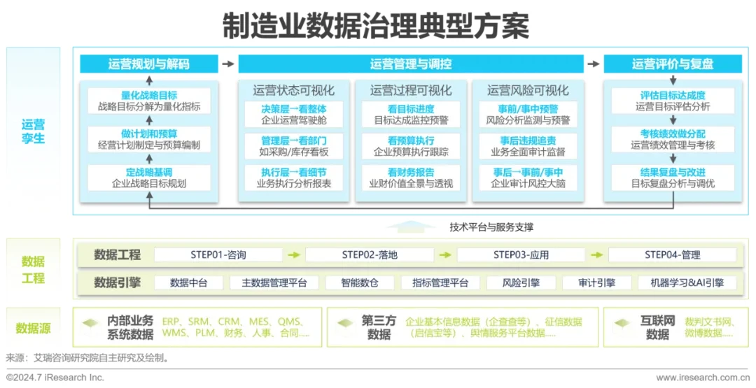制造业企业的数字系统建设水平相对较高,具备ERP、MES、PLM、OA等运营管理系统管理系统,但这些系统彼此孤立,系统间数据标准不一致、数据质量不高、资产建设薄弱且数据共享能力不足。制造业的数据治理核心是“业务驱动”这一理念,围绕这一理念展开数据治理这一工作,从线上化咨询到落地、到场景化应用以及项目建设前期、中期、后期的运营管理进行阶段性建设。顺利获得对企业经营管理、战略运营、绩效管理、审计风控等场景化建设,从不同维度加强企业经营管理的辅助决策、过程分析、风险管控,加速制造业数字化转型。