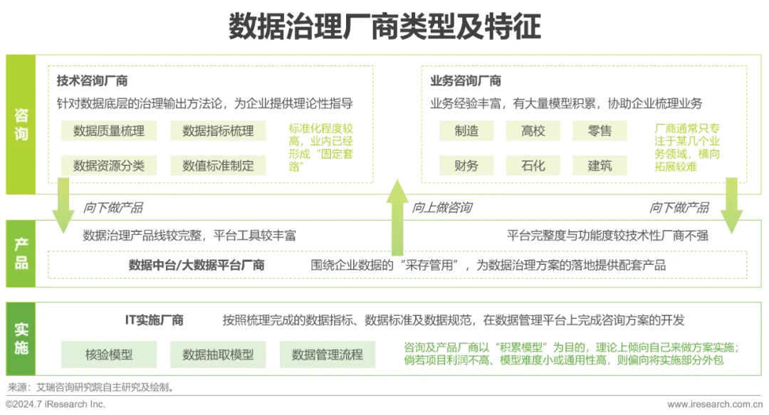 数据治理厂商按产业链由上至下可分为咨询、产品与实施三大类,咨询类厂商又分为技术咨询与业务咨询两小类。