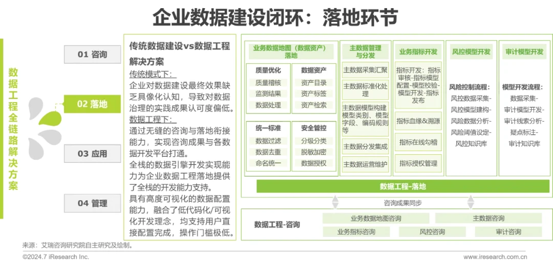落地环节中,能够实现落地的内容包括数据资产落地、主数据管理与分发、业务指标开发、风控模型开发以及审计模型的开发等。基于咨询阶段 “业务数据地图”的梳理成果,能够快速落地各业务域下的业务数据地图模型,支持企业快速召开数据集成汇聚、数据标准执行、数据质量优化、数据安全管控、数据血缘分析、数据资产管理及服务。基于主数据的调研咨询成果,能够实现主数据快速接入与处理,以及一键同步咨询阶段梳理的主数据模型并建立映射、构建灵活的分发规则以及对主数据的全生命周期管理。基于业务指标咨询成果,形成业务指标地图、梳理定义业务指标属性、构建指标责任矩阵,为指标应用奠定基础。基于审计风控咨询,沉淀审计风控知识,构建审计风控资源,沉淀审计风控模型,形成审计风控知识库,为企业风控审计给予模型及知识基础,赋能审计风控应用。