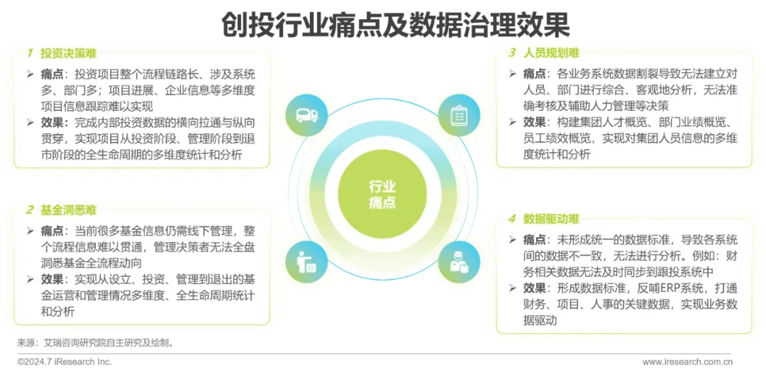 中国投资市场历经三十载耕耘,已成长为全球瞩目的繁荣市场,同时也意味着优胜劣汰加速、竞争更激烈,对投资组织运营能力要求更高。创投组织需要从投、管、退等各个业务环节对投资项目进行管控,管控周期长;且投资项目多,决策材料多,决策者无法在会前快速掌握项目情况来辅助决策,难以全盘掌握基金使用情况以及项目信息,基金健康分析难度大;同时基金多、人员多、项目多、项目区域分布广等因素,使得创投组织难以分析投资人员的分布情况、项目投入是否合理等,无法对人力资源合理分配与调度;因此企业需要顺利获得数据融合与治理,围绕项目、基金、人员、财务等核心业务流程,建立投资业务全生命周期的数据洞察分析体系,助力创投组织提高投资专业力。