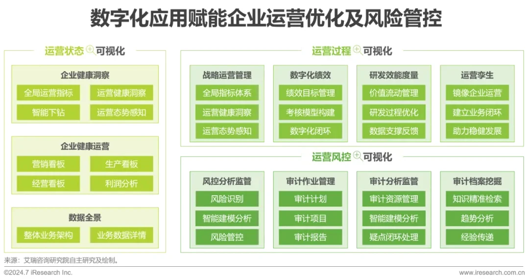 •运营过程可视化:战略运营管理,助力企业战略规划制定、拆解,将战略眼光转化为战略规划,建设企业开展蓝图;运营绩效评价与复盘,对结果客观分析,优化分配机制和战略规划;运营孪生,镜像企业运营价值链路,全面感知和优化运营。