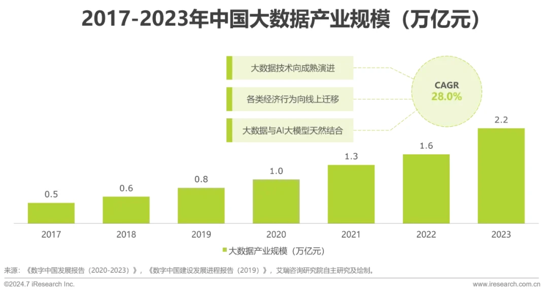 我国大数据产业规模上升幅度与数据产量增幅大致相当,2017-2023年复合增长率为28.0%,2023年规模达到2.2万亿元。这一方面得益于Hadoop、Spark、Flink等开源技术更加成熟;另一方面也是数字经济下消费、生产等各类经济行为全面的由线下向线上迁移的结果;随着近年来以大模型为代表的AI技术突破式开展,大数据找到了全新的天然应用场景,经过治理的数据成为大模型训练的“食物”,支持模型的精细打磨和泛化应用。