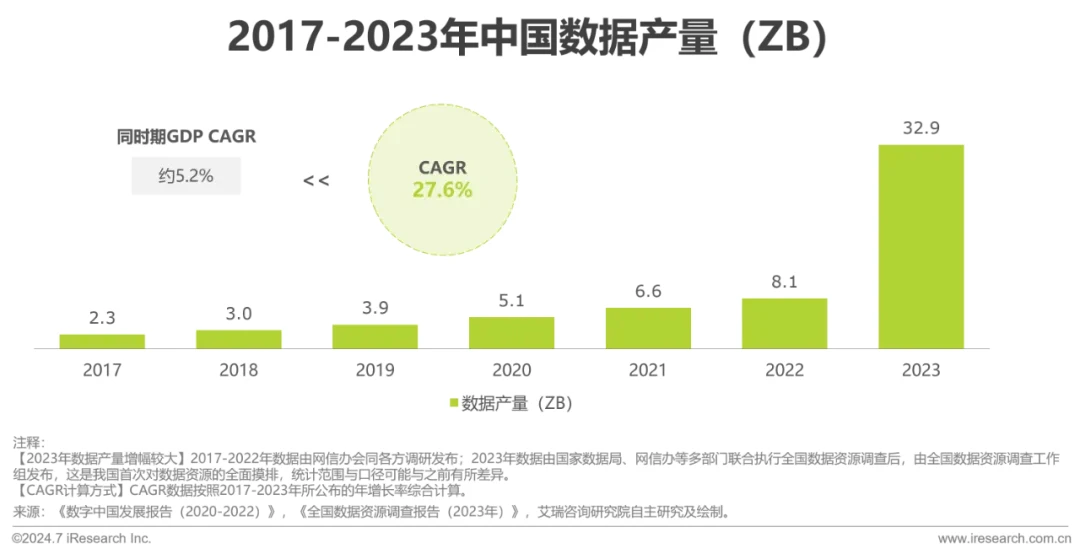近年来我国数据资源规模高速增长,2023年总规模达到32.9ZB,2017-2023年复合增长率为27.6%,是我国同时期GDP复合增长率的5倍有余。数据已成为国民经济的重要生产要素,企业顺利获得汇集、整理、加工与分析实现数据的价值释放,指导企业包括资源分配、流程管理和战略规划等一系列生产经营决策。