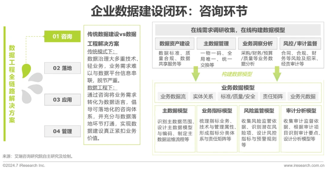 企业数据建设是一项系统工程,需要解析业务现象背后的需求原因,针对性地实现落地,才能帮助企业善用数据资产,充分释放数据价值,进一步为实践给予指导。数据工程建设可分为咨询、落地、应用、管理四大环节,咨询环节是企业进行数据建设闭环管理的第一步,其能力和优势体现在三方面:第一,以“业务数据地图”为抓手,翻译业务需求为数据化语言,为数据建设确立目标与路径;第二,咨询过程与成果线上化,协同用户快速完成需求确认与修正,避免信息偏差;第三,咨询成果无缝衔接至数据平台落地开发,大幅缩短数据建设周期,减少成本投入。整体而言,咨询环节旨在帮助企业摸清数据现状、理顺数据在业务中的流向、找准数据与业务的关系,解决技术与业务脱节和咨询与落地“两张皮”难题,让数据应用少走弯路。