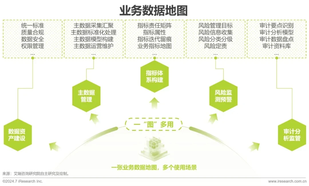 企业顺利获得业务数据地图的梳理,可以将分散在多个系统的、由不同厂商在不同时期建设的信息化系统中的数据按照业务需求有序管理,避免传统数据治理建设中只注重技术和数据的局限性。业务数据地图构成了数据治理的基本流程。1)顺利获得对企业全业务流程的梳理,摸排清楚企业业务流程下存在的基础数据资产;2)梳理业务字段间的实体关系、明确业务与数据责任矩阵;3)在企业全域内制定统一的数据标准,连通企业中原有的数据孤岛,并顺利获得质量检核模型实时检测数据标准度的执行情况;4)对标准数据资产进行分级分类,敏感数据进行数据脱敏,保障企业核心数据安全性。基于业务数据地图的治理成果,更贴近企业业务,能够实现一“图”多用,为数据资产建设、主数据管理、指标体系构建、风险监测预警、审计分析监管等方面给予夯实的数据基础。