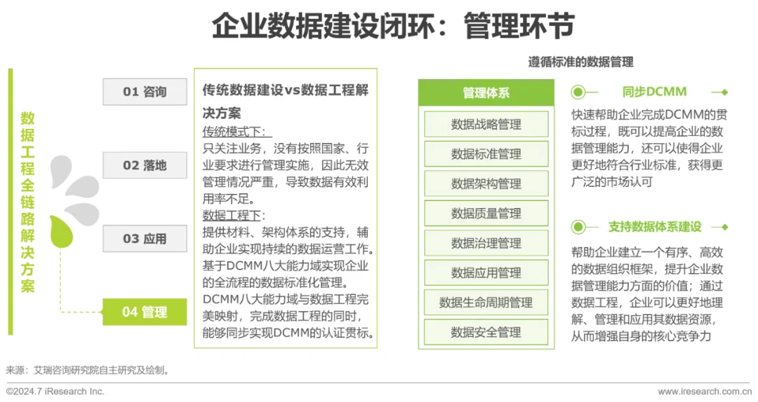 DCMM数据管理能力成熟度评估模型,是我国在数据管理领域首个正式发布的国家标准,从组织、制度、流程、技术等不同领域给予不同维度的数据整合及管理能力,给予从数据生存周期到数据应用的全过程数据管理。顺利获得召开数据工程咨询与落地,全面覆盖DCMM要求的能力项,包括45项数据管理运营体系(形成数据文化)建设+105项技术平台落地需求,实现从数据战略、数据标准、数据架构、数据质量、数据治理、数据应用、数据全生命周期、数据安全等层面的数据管理。同时,为保障企业数据体系的顺利运营,顺利获得数据工程,给予材料、架构体系的支持,实现持续的数据运营工作,确保数据工程能够有效落地。
